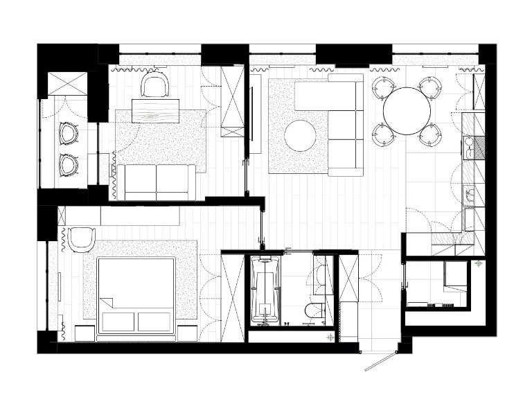 Владельцами этой квартиры стала молодая семейная пара. После приобретения нового жилья, они обратились за дизайн-проектом в студию Екатерины Третьяковой. Главное пожелание заказчиков: функциональное пространство с большим количеством скрытых мест хранения, лаконичный интерьер в спокойной природной цветовой гамме. После согласования планировочного решения и выбора оттенков для оформления интерьера, был выполнен капитальный ремонт с перепланировкой. План квартиры после ремонта и установки мебели. Изначально это была 2-комн. квартира со просторными изолированными комнатами, где на потолке в центре гостиной была несущая балка. В процессе перепланировки, кухню объеденили с гостиной, при этом немного уменьшили площадь последней комнаты. Но за счет этого решения - во-первых организовали отдельный кабинет, во-вторых балка осталась со стороны кабинета, где как ее продолжение установили встроенную мебель и покрасили в тот же цвет. Кухня-гостиная Для основного фона выбрали нейтральный оттенок се