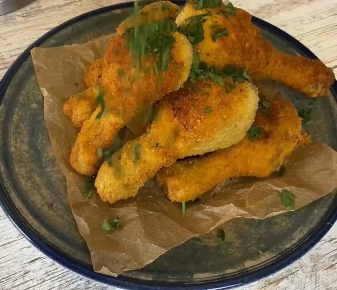 Понадобится: Ножки кур-7 шт. Молоко-200 мл Вода-200 мл Соль-1 ч л Перец-1/2 ч л Чеснок-2 зубчика Сухари панировочные-200 гр Мука-100 гр Яйцо-2 шт. Соль, перец, специи (куркума 1 ч л, паприка 1 ч л, прованские травы 1 ч л) Зелень для украшения. Готовим: Ножки кладём на сковородку, заливаем молоком, водой. Добавляем чеснок, соль, специи и тушим на маленьком огне мин 20. Переворачиваем и ещё тушим 10 мин. Пока тушатся ножки, в муку добавляем специи, яйца болтаем. Теперь берем ножки валяем в муке, потом макаем в яйце и в сухари. Дальше на сковородку, и обжариваем на масле до золотистого цвета. Обсыпать зеленью и наслаждаться! Приятного аппетита!
