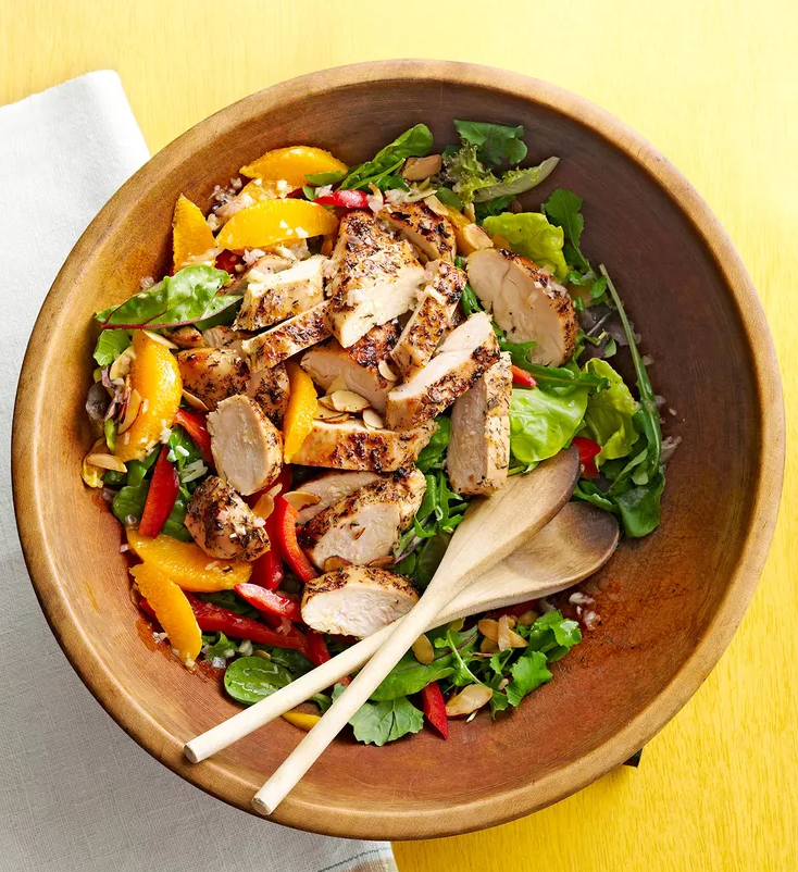 Ингредиенты · 400г. куриного филе · 2 чайные ложки мелко натертой апельсиновой цедры · ⅓ стакана апельсинового сока · 6 зубчиков чеснока, мелко нарубленного · 2 столовые ложки меда · 1 ½ чайной ложки сушеного тимьяна, молотого · ½ чайной ложки соли · ¼ чайной ложки молотого черного перца · 2 столовые ложки оливкового масла · 2 столовые ложки белого винного уксуса · 2 столовые ложки апельсинового сока · Полторы чайные ложки мелко нарезанного лука-шалота · 4 стакана нарванной зелени салата · 1 средний красный сладкий перец, тонко нарезанный · 2 средние апельсины, очищенные и нарезанные · Нарезанный миндаль, поджаренный (по желанию) Приготовление Поместите курицу в пакет для запекания и уложите его в неглубокое блюдо. Для маринада смешайте апельсиновую цедру, 1/3 стакана апельсинового сока, 4 зубчика чеснока, мед и тимьян. Залейте маринад в пакет и запечатайте его. Мариновать филе следует в холодильнике от 6 до 8 часов, время от времени переворачивая пакет. Слейте маринад из пакета и дос