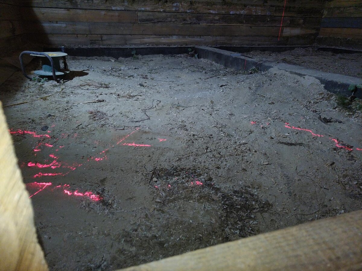 Сегодня начну рассказ о полах в своей бане - полная история ее строительства. По некоторому размышлению я решил отказаться от деревянного пола и делать стяжку по грунту. Плиту сверху закрыть керамогранитом под дерево (есть нескользящие варианты) а под него сунуть теплый пол... Водяной, естественно, ибо простые варианты нам не интересны. Итак, давайте по порядку. Песка в контур фундамента я натаскал еще до строительства стен. Теперь его надо разровнять, в чем мне сильно помог лазерный уровень. Прикопал его в углу, по нему выставил пару маяков и давай разравнивать правилом. Затем протрамбовал песок виброплитой и повторил процесс. После этого я заказал пеноплекс, а пока он шел, занялся фундаментом для печки. Заглубил по контуру фундамента и засыпал дно ямы остатками щебенки (с землей), сделав 5 см подушку. Затем по лазерному уровню выставил опалубку, скрученную из обрезков ЛДСП. Навязал внутри арматуру из остатков проволоки. Потом посоветовался с товарищем и перенес опалубку с заходом на