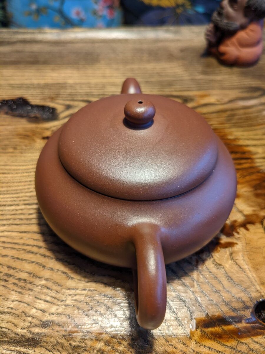 Я стараюсь обычно не связываться с "Цзинь Ло" и "Цзюнь Мэями", так как не раз обжигался и их вкус мне не сильно заходит. Эти "завитки" взял по личной рекомендации и они оказались очень неплохи. В дело пошёл второй чайник под красные, ручной работы (её отчетливо видно на 2 фото дна и на 3 фото с крышкой). Не люблю плоские чайники, но этот хорошо работает. Настой получился янтарный, идеальный чистый. В аромате сухого листа: пряности, печенье, дымок.