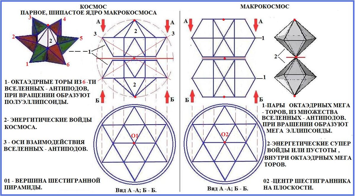 * В этой статье мы впервые подробно рассматриваем один из вариантов Макрокосмоса, внутри которого присутствует две Гипервселенных, не имеющих планетарных образований, где присутствуют только энергетические образования. В таком варианте построения Макрокосмоса, Космос (если он не внутри Макрокосмоса), не может существовать отдельно, в виде совокупности 14 Вселенных. На рисунке мы показали Космос, как обособленный объект, только для того, чтобы наглядно показать, что именно Космос (ядро) задаёт внешнюю форму Макрокосмоса, в виде двух эллипсоидов.