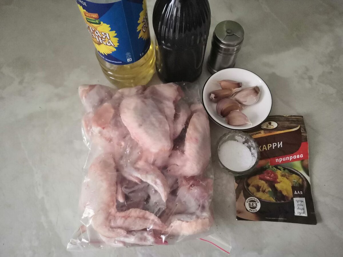 Ароматные, сочные куриные крылышки, замаринованные с добавлением соевого соуса и запечённые в духовке, можно подать к столу в будний день в качестве основного блюда, дополнив гарниром. Приготовить такие крылья можно и к приходу друзей. Несмотря на то, что ингредиенты самые простые и доступные, вкус запечённых крылышек получается просто потрясающим. В готовом блюде, практически нет жидкого соуса, поэтому крылья можно брать руками. Для приготовления нам понадобится. Подготовим ингредиенты. Крылья порубим по кости, убрав самые тонкие части, очистим чеснок. Подготовим специи. Натрем чеснок на мелкой тёрке, добавим карри и соль (будьте осторожны с солью, т.к. соевый соус довольно солёный), добавим растительное масло. Натрем специями крылышки и дадим им настояться в соусе 30-40 минут. Ставим противень в духовку на 140° и держим до готовности (примерно 35-40 минут). Ароматные крылышки в соевом соусе готовы. Приятного аппетита!