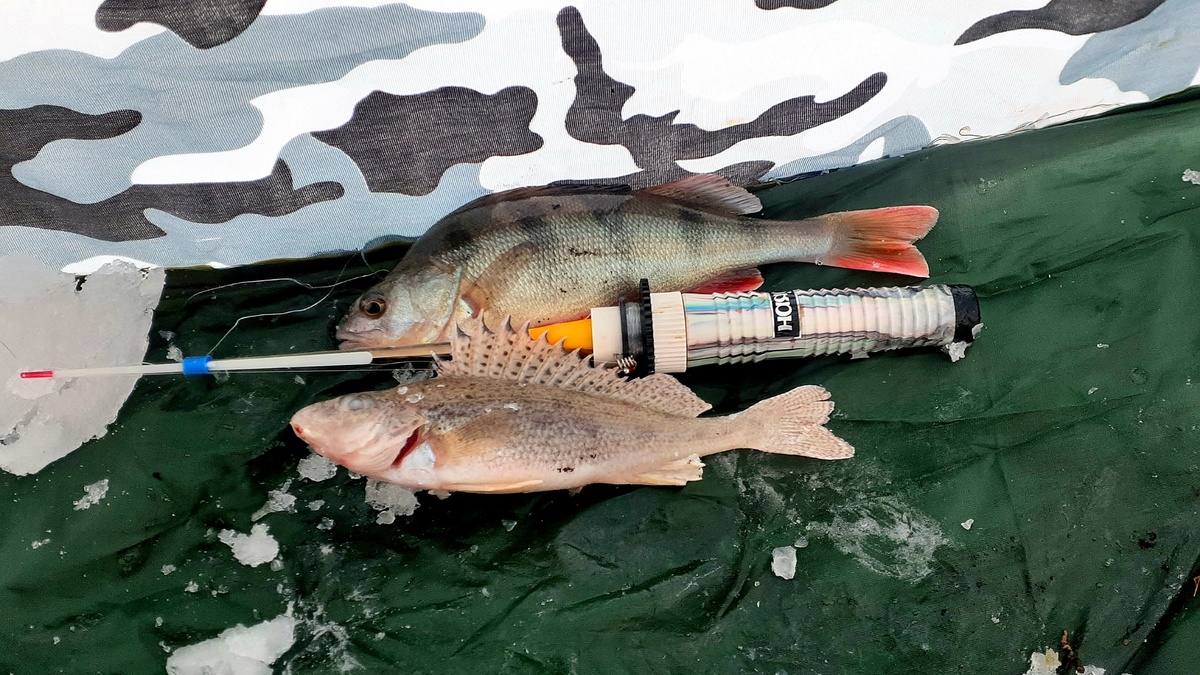 Ожидание первой поклёвки было долгое, уже рассвело, время к десяти, и тут кивок дрогнул, потом выгнулся, подсечка и вот он - Ёрш королевский, таких десяток и полноценная уха. Далее был сход приличного окуня, вот незадача. Но всё же продолжаем играть! Затишье! Уже поменял кучу мормышек, на чёрную уралочку с зелёным глазком сбоку ловлю окуня, нормальный размер, подумал я, и дальше пошло, поехало!