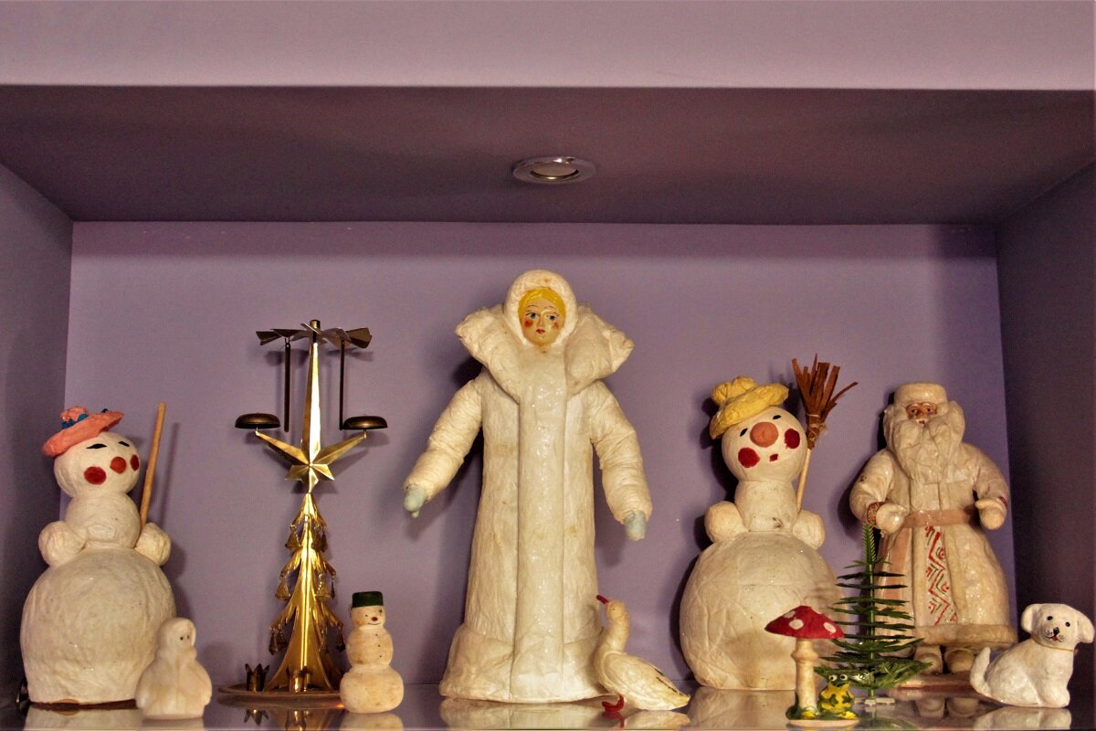 Особое место в коллекции занимают два снеговика, сделанных из ваты, покрытой особенным клеем и инкрустированные бумагой. В нашем детстве по такой технологии изготавливались фигурки Деда Мороза и Снегурочка. Снеговики же были большой редкостью. Я нашёл их у одного коллекционера в Санкт-Петербурге. У каждого своя индивидуальность и этикетка: произведены они в 1975 году на заводе новогодних игрушек в Ленинграде.