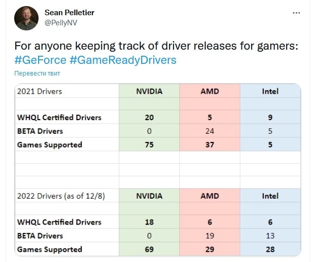 Старший менеджер по продуктам NVIDIA Шон Пеллетье (Sean Pelletier) недавно поделился интересной статистикой о новых выпусках драйверов для видеокарт. Он наглядно показал (в таблице), насколько NVIDIA опережает конкурентов в виде AMD и Intel по выпускам сертифицированных Microsoft WHQL-драйверов. Эти цифры относятся к 2021 и 2022 годам. ”Зеленые” заявляют, что за прошлый год они выпустили в четыре раза больше драйверов, чем AMD и Intel. А в 2022 количество релизов софта превысило показатели конкурентов более чем в два раза. WHQL — это аббревиатура Microsoft Windows Hardware Quality Lab. Может распространяться через Центр обновления Windows.