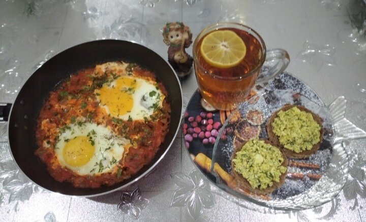 2 тоста из хлеба энергия здоровья (40г), натёртые чесноком (2г) с рийетом из печени трески (45г), шакшука (300г) и чай (300мл) с лимоном