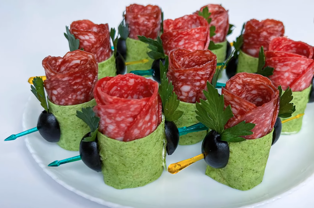 Сегодня приготовим закуску "Розочка" для новогоднего стола, которая порадует ваших близких и гостей. Ингредиенты: - тонкий лаваш; - тонко нарезанная колбаса; - маслины; - сливочный сыр; - свежая петрушка. Приготовление: Для этого возьмем тонкий зеленый лаваш, или какого цвета найдете в магазине и порежем на полоски шириной 3 сантиметра, а длиной 17 см. Смазываем каждую полоску лаваша сливочным сыром и выкладываем сверху тонко нарезанную колбасу таким образом, чтобы она выглядывала равномерно за край лаваша. Далее кладем на каплю сливочного сыра маслину и скручиваем все в трубочку. Скрутив наш рулет, берем еще одну маслину и разрезаем ее вдоль. А затем закрепляем рулет, используя половинки маслины, как показано на фото. Так проделываем с каждым кусочком лаваша и выкладываем на тарелку. Закуска готова! Приятного аппетита!