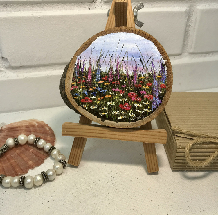Гороскоп друидов по дате рождения. Миниатюра на срезе дерева Липа. Пейзаж с полевыми цветами. Сувенир-оберег.