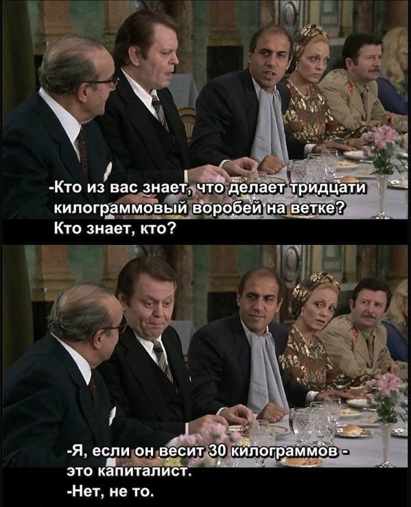 Своё чувство юмора я определяю по сцене из фильма "Безумно влюбленный" с Челентано и Орнелла Мути. Где за огромным столом сидели самые знатные и влиятельных люди страны Челентано, а точнее Барнаба Чиккини рассказывает шутку "Что делает 30-килограммовый воробей на ветке?". Умоляю, кто не видел этот фильм, обязательно посмотрите! Он в целом прекрасен, не хуже "Укрощения строптивого", а по мне так, даже симпатичнее.