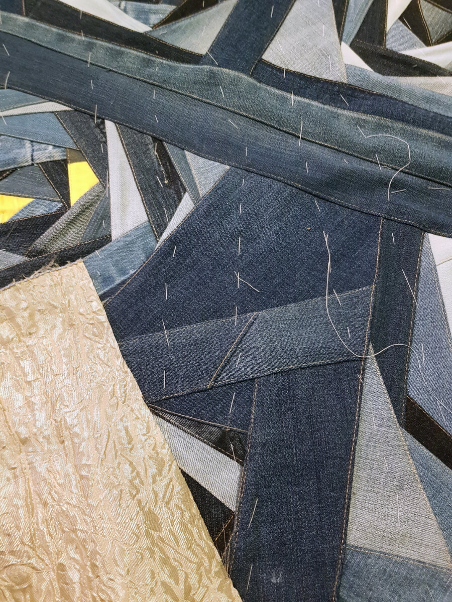 Как только вы что-то выбросите - оно вам понадобится... Ну кто ж летом мог предположить, что осенью я займусь пэчворком и шитьем? Мой самый нелюбимый процесс - окончательная сборка. Люблю делать части, а приводить все в готовое состояние - нет! Приметывала основу к подложке. Да , о выкинутых вещах. Летом я наконец-то сделала себе потолочную сушилку для белья на балконе, и, конечно, от напольной я избавилась. Так вот на ней как раз было бы очень удобно как стегать, так и сметывать большое полотно. Дальше ещё более нелюбимый процесс - пристрочка. Прохожусь по некоторым стыкам блоков и отстрочкам ещё раз, где-то больше, где-то меньше. Попасть строчкой в строчку тоже задачка не из легких. Джинса тяжелая, вырывается и из рук, и из-под лапки. Уже есть идея, как собирать и делать изнанку по-другому. Буду собирать другое что-нибудь - протестирую Были мысли "проквилтить" пустые блоки, но как-то внутренне я против "засорения" чистой джинсы. Думаю даже о ручной прошивке в стиле "боро", но тож