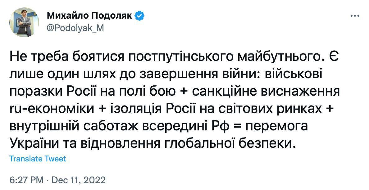 Советник руководителя ОП Михаил Подоляк считает, что именно в этом заключается единственный путь к завершению войны.