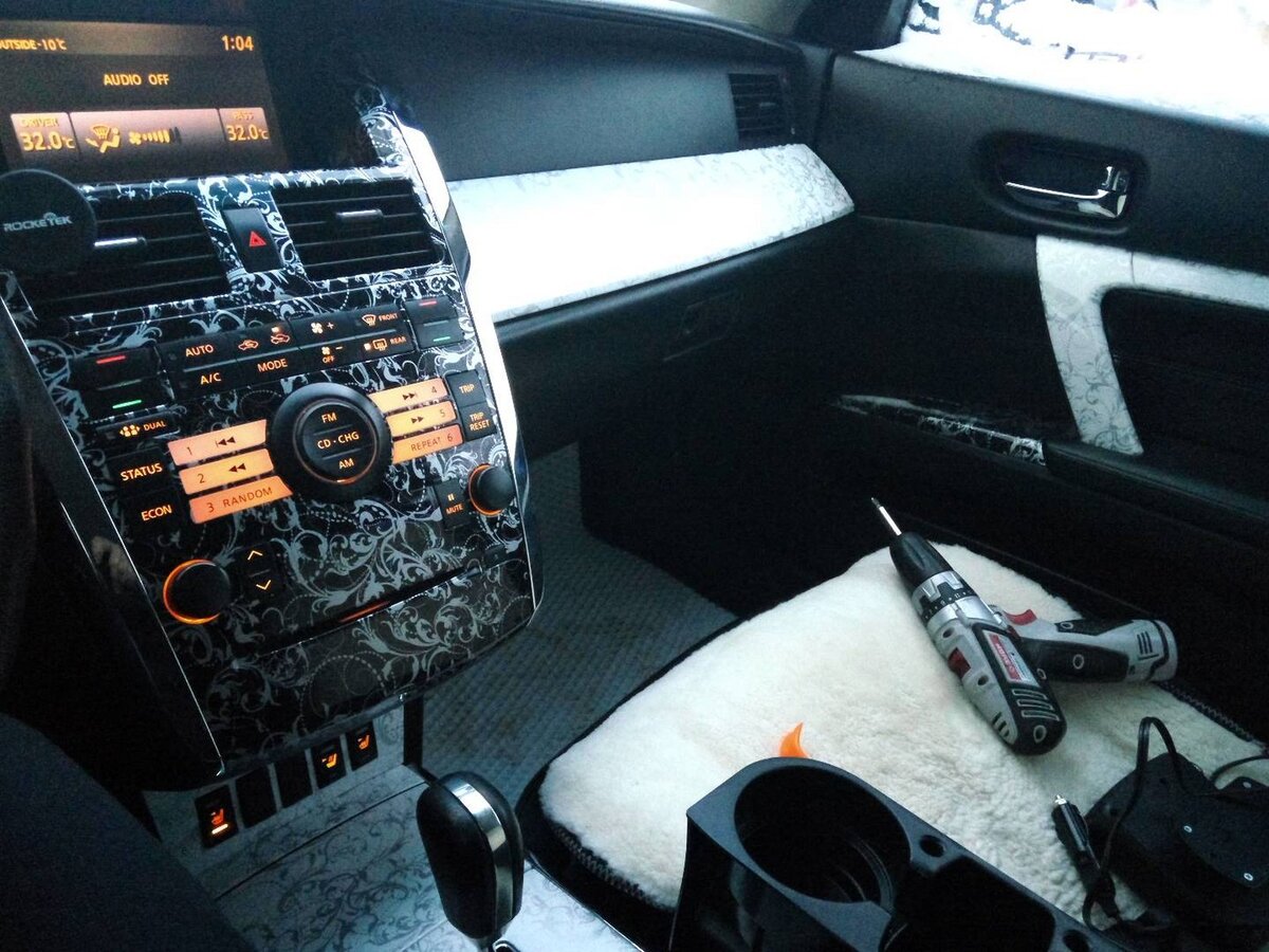Всем привет! Случайно попались фотки моего бывшего авто - Nissan Teana J31 в самой топовой комплектации. Движок 3,5 литра, 245 лошадок... Это была моя первая мощная машина. Впечатления после Ford Mondeo 3 - пушка! Итак, сегодня я расскажу о стайлинге Nissan Teana J31, как внутреннем, так и внешнем. Светлый салон у этих машин еще более-менее приятный. А вот темный - так себе. Поэтому я как-то решился и сделал аквапринт на все панели. Это не пленка! Смотрится в живую - огонь! Ночью выглядит вот так. У белых панелей черный рисунок прям заиграл новыми красками! Затем я вмонтировал RGB подсветку. С пульта + куча цветов! Больше всего розовоый нравился, в сочетании с белым классно смотрелось! Как видно и ручки на дверях тоже сделал. На руле - оплетка. Я хотел перешить, но никто не брался в нашем городе, т.к. на руле деревянные вставки. Тогда EVA-коврики только-только появлиись. Я заказал белые! Маркие, ужас просто! Но смотрелось - бомбически! Фото - сразу после мойки. Недолго коврик чистым б