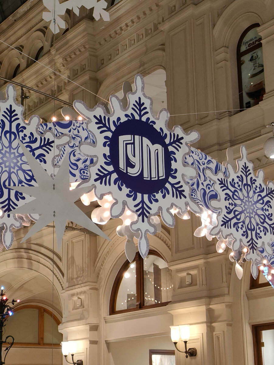 Новогодний, сказочный ГУМ 2022-2023гг. Оформлен под гжель.