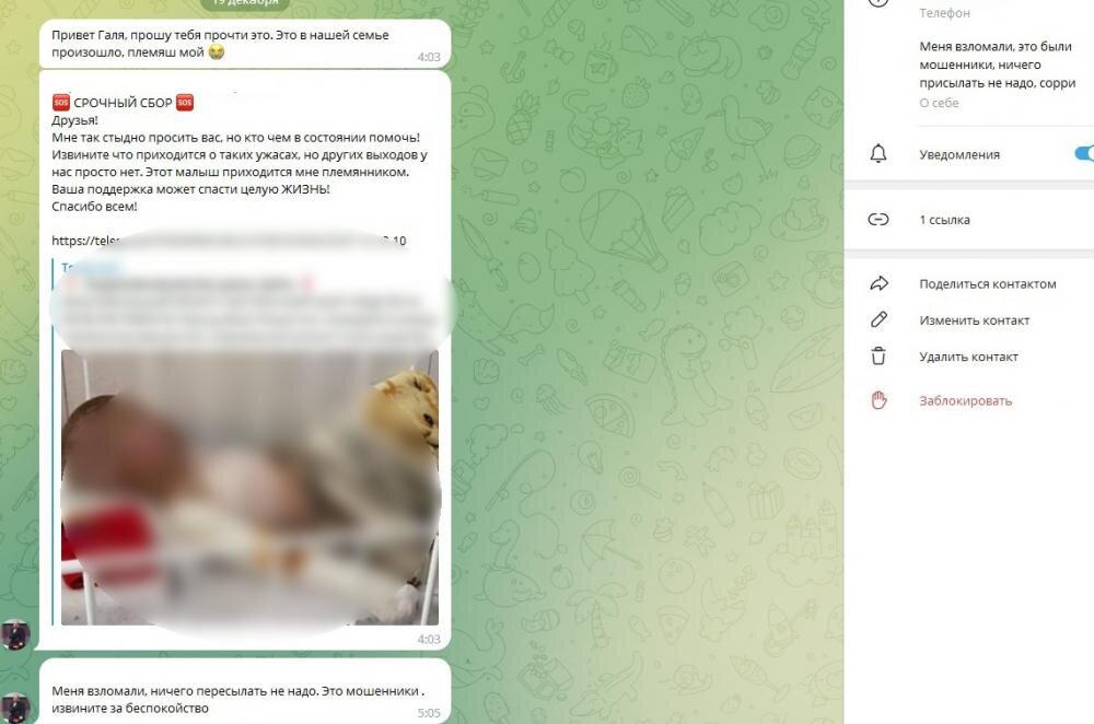 Доктор исторических наук из Новосибирска Виктор Козодой ночью сегодня, 19 декабря, был вынужден написать более 150 сообщений в Телеграме о том, что его взломали и никакие деньги на спасение его крохотного племянника, переводить не требуется. Аферисты вскрыли личный аккаунт Виктора Ивановича, обратившись к каждому в списке его контактов по имени, пишет сайт Бердск-Онлайн. Прислали фото, относящееся к шок-контенту - обгоревший и израненный ребенок. «Привет Галя, прошу тебя, прочти это. Это в нашей семье произошло, племяш мой, - началось сообщение, сопровождаемое далее извинениями отправителя за просьбу помочь финансово. - Мне так стыдно просить вас, но кто чем в состоянии помочь! Извините, что приходится о таких ужасах, но других выходов у нас просто нет. Этот малыш приходится мне племянником. Ваша поддержка может спасти целую ЖИЗНЬ! Спасибо всем!». Виктор Козодой рассказывает сегодня сайту Бердск-Онлайн, что о взломе Телеграма друзья ему сообщили в другом мессенджере. - «Все ли у вас в