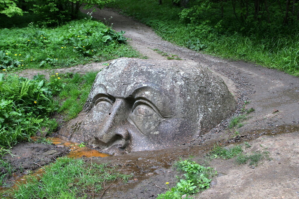 Поэтому и было решение провести весеннее воскресение в поисках Каменной Головы. Это оказался пейзажный парк. Слегка заброшенный. Погода, как обычно резко поменялась. Пошел мелкий дождь. Тишина необыкновенная. Не зря сюда приезжали русские художники писать свои полотна. Но есть и творения рук человеческих. Красивый мостик. Усадьба была подарена любимой дочери Николая I Марии Николаевне к свадьбе с герцогом Максимилианом Лейхтенбергским. В этом дворце состоялось знакомство Николая Второго и Григория Распутина. Тут бывал Дюма - отец. Льюис Кэрролл был в своем единственном путешествии за границу. Вот так он выглядит с дороги Петергоф - Ломоносов. А так со стороны парка. Дворец как- то странно отреставрирован.С двух сторон. А с других двух сторон - разруха.