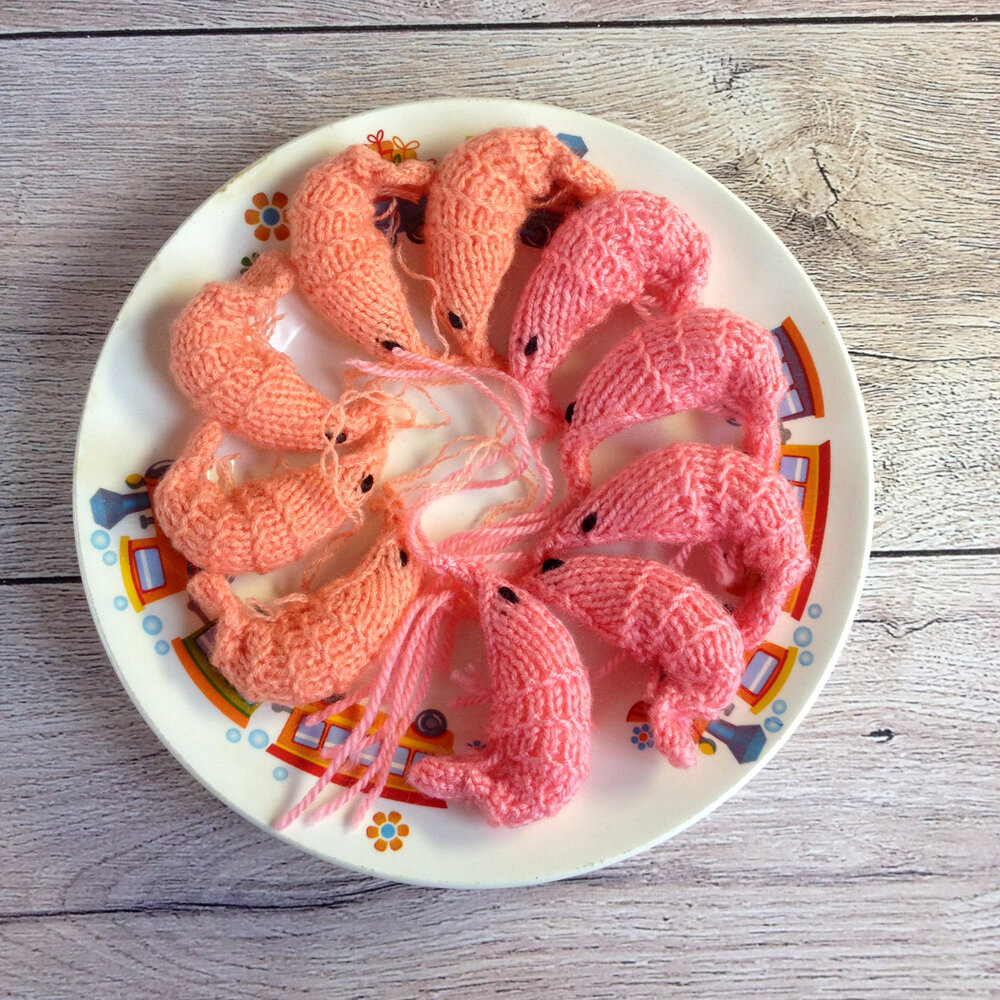 Здравствуйте! Люблю вязать еду крючком :) И в процессе вязания овощей, фруктов, ягод и разных вкусняшек я никак не могла найти толковые схемы креветок. Потратив несколько часов на поиски, решила, что самое время разработать схему самой! И немного поколдовав с пряжей, нашла для себя оптимальную схему вязания. И, чтобы сэкономить ваше время, делюсь с вами. Может кому-нибудь, пригодится. :) Схема простая, и разобраться в ней не составит труда даже у начинающих! Итак, начнём. Для работы вам потребуются следующие материалы: 1) Пряжа YarnArt (цвет розовый и лососевый) 2) Спицы 2,5 3) Игла 4) Ножницы 5) Наполнитель холлофайбер Начинаем вязать: (В начале каждого ряда первую петлю снимаем, последнюю провязываем кромочной) 1 ряд: набрать 6 петель 2 ряд: все лицевые 3 ряд: все изнаночные 4 ряд: все лицевые 5 ряд: все изнаночные 6 ряд: все лицевые 7 ряд: все изнаночные 8 ряд: все изнаночные, прибавка в конце ряда 9 ряд: все лицевые, прибавка в конце ряда 10 ряд: все изнаночные 11 ряд: все изнаночн