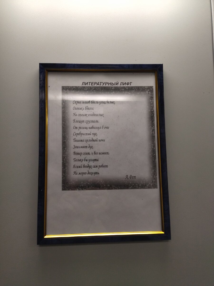Приятно, когда жители демонстрируют высокую культуру. Уютная новость с улицы Маршала Жукова. Там в доме №4 на новозапущенном лифте появилось стихотворение Афанасия Фета «Скрип шагов вдоль улиц белых» в деревянной рамке. Человек, который его повесил, указал, что теперь этот лифт является литературным. Чтобы вы не ломали глазки, приведем вам текст стихотворения в печатном виде: Скрип шагов вдоль улиц белых, Огоньки вдали; На стенах оледенелых Блещут хрустали. От ресниц нависнул в очи Серебристый пух, Тишина холодной ночи Занимает дух. Ветер спит, и всё немеет, Только бы уснуть; Ясный воздух сам робеет На мороз дохнуть. Произведение было написано в 1858 году, но и сейчас приятно дополняет атмосферу русской зимы, которая уже на носу. Ладно, давайте заодно небольшой экскурс в персоналию проведем, раз уж собрались вместе по поводу Фета. В 14 лет Афанасий Афанасьевич лишился дворянского титула, так как было установлено, что брак его родителей оформлен уже после рождения ребенка. Будучи уже вз