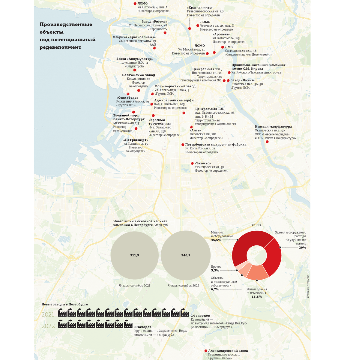 Заявки подали также "Петроспирт" (участок на острове Грязный), АБЗ–1 (площадка в Коломягах), ГК "Дарница" (хлебобулочное производство на ул. Маршала Тухачевского), ГК Thermex (36 га на пр. Народного Ополчения). Структура компании Green Point Феликса Длина (№ 153 в Рейтинге миллиардеров "ДП" — 2022) подала заявку на площадку бывшего опытного нефтемаслозавода имени Шаумяна. Группа RBI Эдуарда Тиктинского (№ 40 в рейтинге) попросила перевести из производственной зоны участок на Новолитовской ул.
