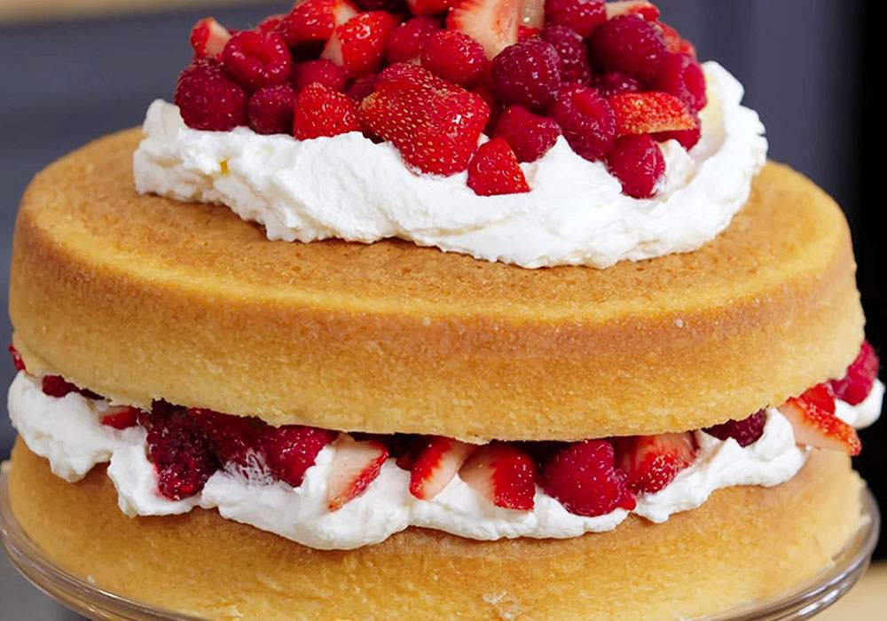 Собирайте торт на подставке или блюде. Положите первый корж и смажьте его взбитыми сливками. Следующим слоем распределите ягоды и накройте вторым коржом.