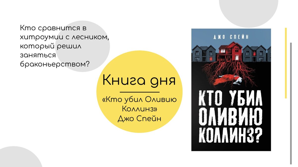 Загадочностью она напоминает сериал "Твин Пикс", детективной линией - лучшие романы Агаты Кристи. И все это про роман Джо Спейна "Кто убил Оливию Коллинз". Зритель с первых страниц погружается в жизнь маленького городка и знакомимся с его необычными обитателями: сын популярного продюсера, бизнесвумен, пара, следящая за всеми новыми тенденциями, избалованная молодая девушка и её богатый муж, холостяк-бабник и скромная пожилая дама, та самая Оливия Коллинз. Но вскоре она умирает при загадочных обстоятельствах, а окружающие делают вид будто ничего не произошло. Интриги, секреты, скелеты в шкафу - в этой книге присутствует все, за что мы любим хороший детектив. А вместе с этим Джо Спейну удается раскрыть каждого персонажа, показывая их читателю с разных сторон. Цитаты из книги: Лили похоронила маму в восемнадцать, а отца в двадцать четыре и почувствовала, что ее понесло по течению, без якоря семьи и родительского дома. В итоге она погрузилась с головой в работу, надеясь обрести в ней ст