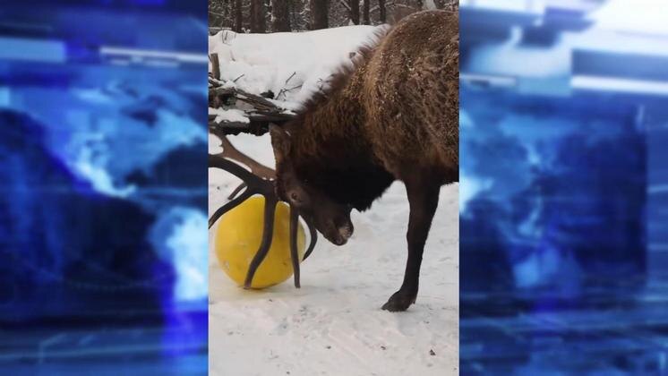В Новосибирске олень поиграл с мячом и покатал его по снегу на камеру. Видео опубликовали в Telegram-канале новосибирского зоопарка.