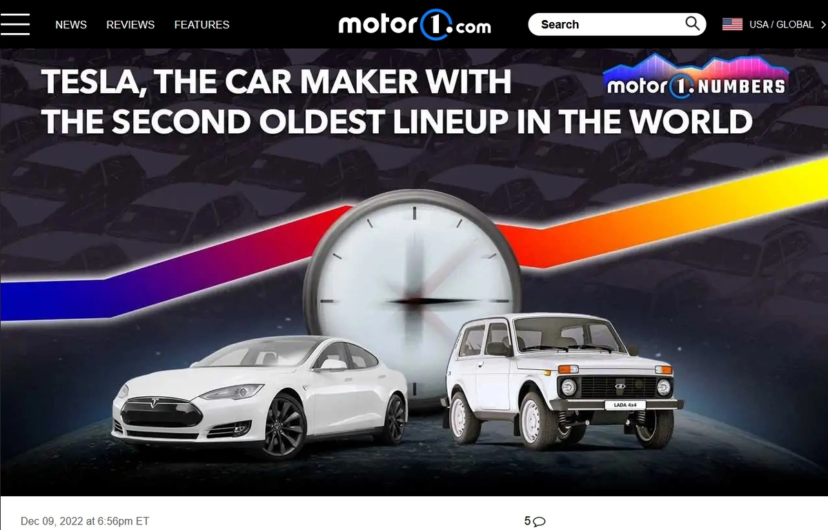 Международное автомобильное издание Motor 1 провело исследование, касающееся вывления производителей с самым старейшим модельным рядом. Подсчет возраста автомоделей производится путем вычисления разницы во времени между сегодняшним днем (декабрь 2022) и днем, когда серийный автомобиль официально стал доступен к покупке (а не впервые продемонстрирован). В расчет не были включены фейслифтинги, рестайлинги и любые виды обновлений, кроме внедрения нового поколения. "Ребейджи"(присвоение старых названии новым моделям) также не учитывались. Также были исключено большинство китайских производителей. Согласно исследованию, Lada является автопроизводителем с самым старым модельным рядом. Средний возраст представителей 'этой российской марки – 18,9 лет. Но, что удивительно, Tesla заняла второе место со средним показателем 7,8 года для своих 4 доступных к покупке в настоящее время моделей. Первая модель Tesla Model S была представлена в марте 2009 года. 12/12/2022 Ю.Е.Е.
