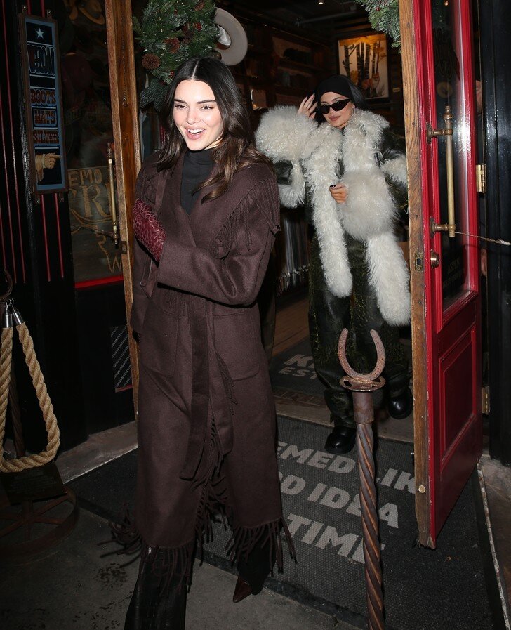 Кендалл Дженнер знает, как использовать самый модный оттенок этого сезона – «тёплый шоколад». Модель надела длинное пальто-халат с бахромой, водолазку, строгие кожаные брюки, а также перчатки из плетёной кожи Bottega Veneta. Образ Кендалл Дженнер дополнила остроносыми ботильонами на небольшом каблуке и вместительной замшевой сумкой. Все вещи, использованные в образе, имеют различные оттенки коричневого цвета и прекрасно дополняют друг друга. В этом сезоне рекомендуется использовать подобные образы, которые отлично подойдут для холодной зимы.