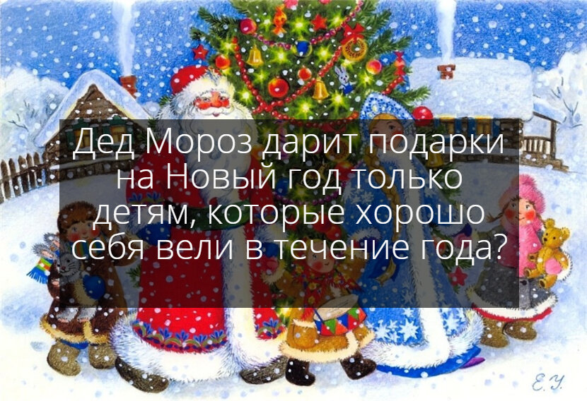 Также некоторые родители, дедушки/бабушки, опекуны сообщают своим детям, что в случае, если они будут вести/учиться плохо, то Дед Мороз не подарит им на Новый год подарок. Две представленные выше родительские формулировки, относительно возможности получения подарка на Новый год, похожи, но между ними есть различия. В первом случае (если ты будешь себя хорошо вести/учиться, то Дед Мороз на Новый год принесет подарок, который ты хочешь) речь идет о поощрении, а во втором (если будешь вести себя/учиться плохо, то Дед Мороз не принесет подарок) – о наказании. По этому поводу в интернете можно найти следующею картинку: