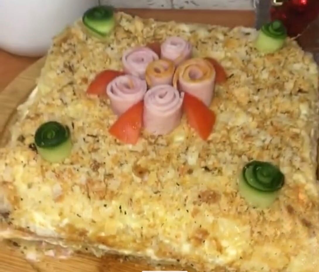 Все мы готовимся к праздникам. Выбираем разнообразные блюда, горячее, салаты и закуски, а так же десерты. Но не все хозяйки пробовали приготовить не сладкий торт. А ведь идея заслуживает внимания, так как такой торт станет отличной закуской на праздничном столе, а так же привлечет внимание удивленных гостей. Им можно смело заменить надоевший салат или тарелку с бутербродами. Ведь порционно такой торт ни чем не уступит привычным канапе или брускеттам, а может даже превзойдет их. К тому же готовить его очень просто, а выглядит он на столе празднично и аппетитно. Ингредиенты · Тесто слоенное · Ветчина · Грибы, лучше использовать шампиньоны · Лук · Морковь · Сыр · Майонез Готовим Для начала нужно приготовить коржи. Для этого в листах слоенного теста делаем небольшие проколы. Отправляем листы в духовку на 180 градусов на 20-30 минут, до готовности. Как только тесто готово, нужно его остудить и разобрать коржи на несколько листов. После этого на первый корж теста выкладываем слой ветчин