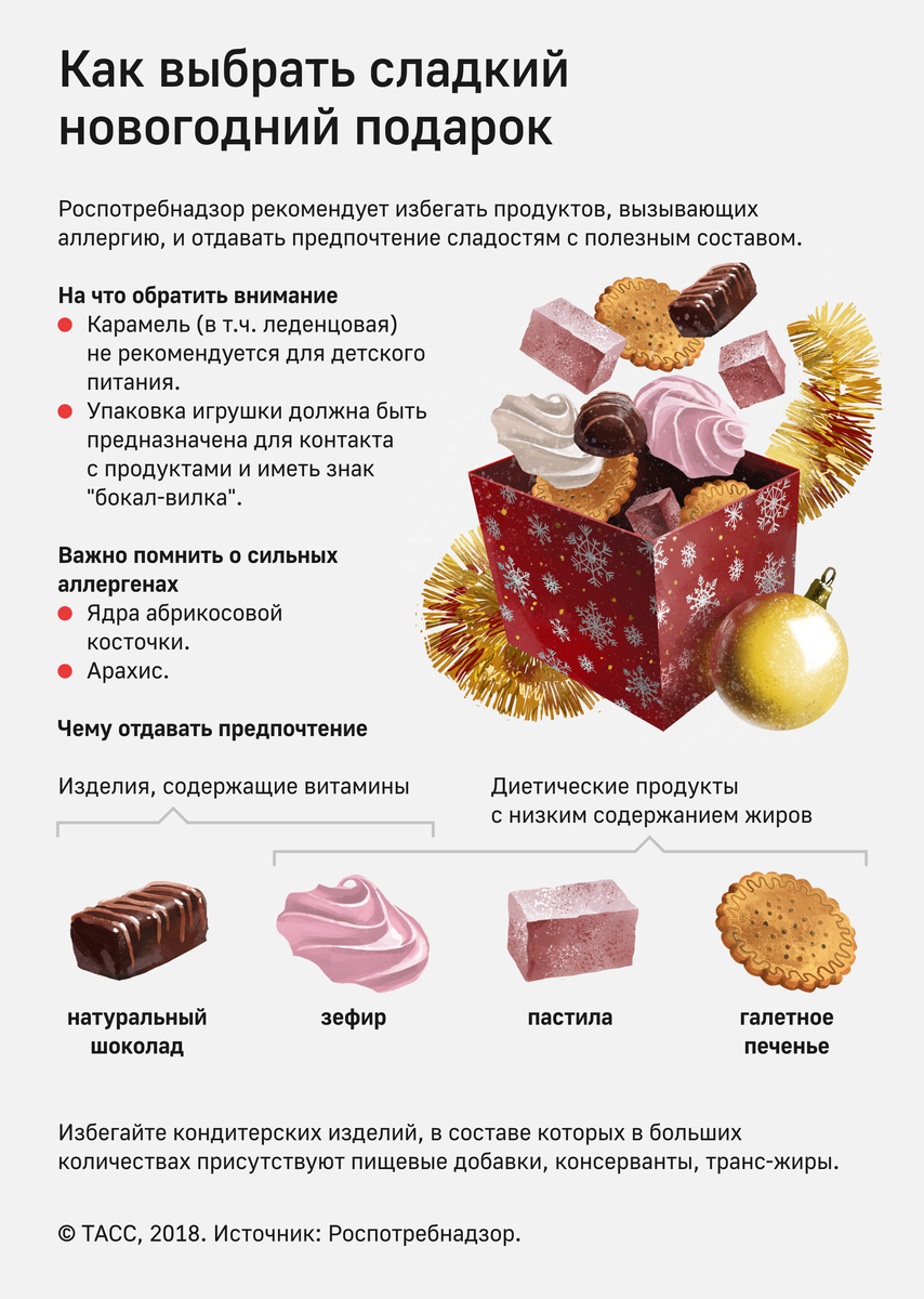 Сладкий подарок на Новый год — один из способов порадовать ребенка. Однако к выбору набора с кондитерскими изделиями следует подходить внимательно: согласно рекомендациям Роспотребнадзора, мармелад, пастила и зефир — самые безопасные сладости. В них отсутствуют пищевые добавки и искусственные красители. Важно обратить внимание на наличие в кондитерских изделиях потенциальных аллергенов, в том числе ядер абрикосовой косточки и арахиса. В составе детского сладкого подарка не должно быть: усилителей вкуса и аромата, консервантов (Е200, Е202, Е210, Е249), натурального кофе, ароматизаторов, идентичных натуральным, а также гидрогенизированных масел и жиров. Наполнять наборы карамелью также не рекомендуют. Подробнее о том, как выбрать сладости к новогоднему столу и в качестве подарка, — в инфографике ТАСС.