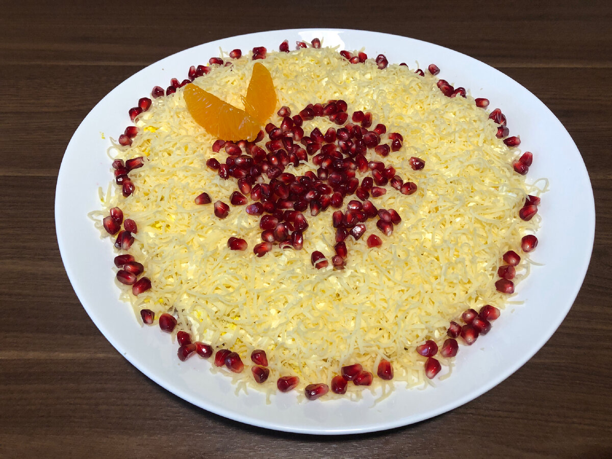 Для приготовления нам понадобится: Говядина отварная 200 гр.(лучше жирненькую) Сыр 200 гр. Яйца 4 штуки Лук 2-4 штуки в зависимости от размера(необходимо покрыть мясо) Яблочный уксус 6% (для маринада лука) Майонез Первым делом нарезаем лук и наливаем уксус и оставляем мариноваться 5-10 минут Разделяем мясо на волокна. Сразу на блюдо в котором будем подавать. Далее поливаем майонезом Сверху лук, кладите по вкусу) Майонез Яйца натертые на терке И последний слой майонеза. Последний слой в салате натертый сыр, Важно тк сыр не покрывается майонезом используйте вкусный и любимый сыр Украшаем гранатом. Гранат придаст не только красоту блюду, но еще добавит кислинку и салат станет еще вкусней. пробуйте Приятного аппетита