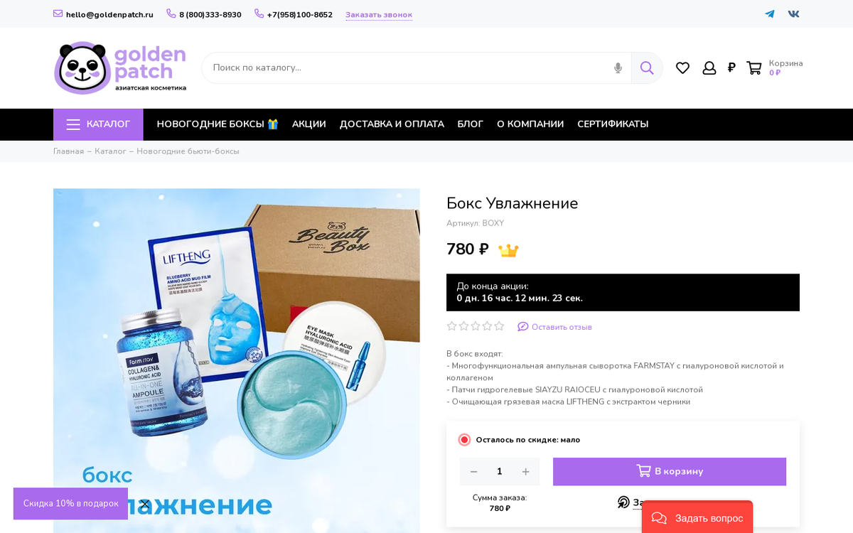 Бытует мнение о том, что необходимо тратить много денег, чтобы кожа лица выглядела безупречно. Без прыщей, стянутости, черных точек, расширенных пор. И благодаря этому многие женщины... отказываются от ухода. Сегодня докажем обратное: сэкономим средства, но при этот сделаем шаг навстречу сияющей и чистой коже лица. Мир красоты ежедневно совершает рывок вперёд и за небольшую стоимость сейчас можно купить целый набор с хорошими средствами. А значит, получим разносторонний уход за счет нескольких средств и их командной работы. Например, находкой для меня стал бокс «Увлажнение» на сайте Golden Patch. Во-первых, стоит отметить, насколько все средства идеально сочетаются между собой и дополняют друг друга. А еще это красивый и очень нужный подарок, который точно придется по вкусу каждой девушке. Ампульная сыворотка с гиалуроновой кислотой и коллагеном подходит для любого типа кожи и благоприятно влияет на тон лица. Средство направлено на максимальное увлажнение и подготовку к следующему эт