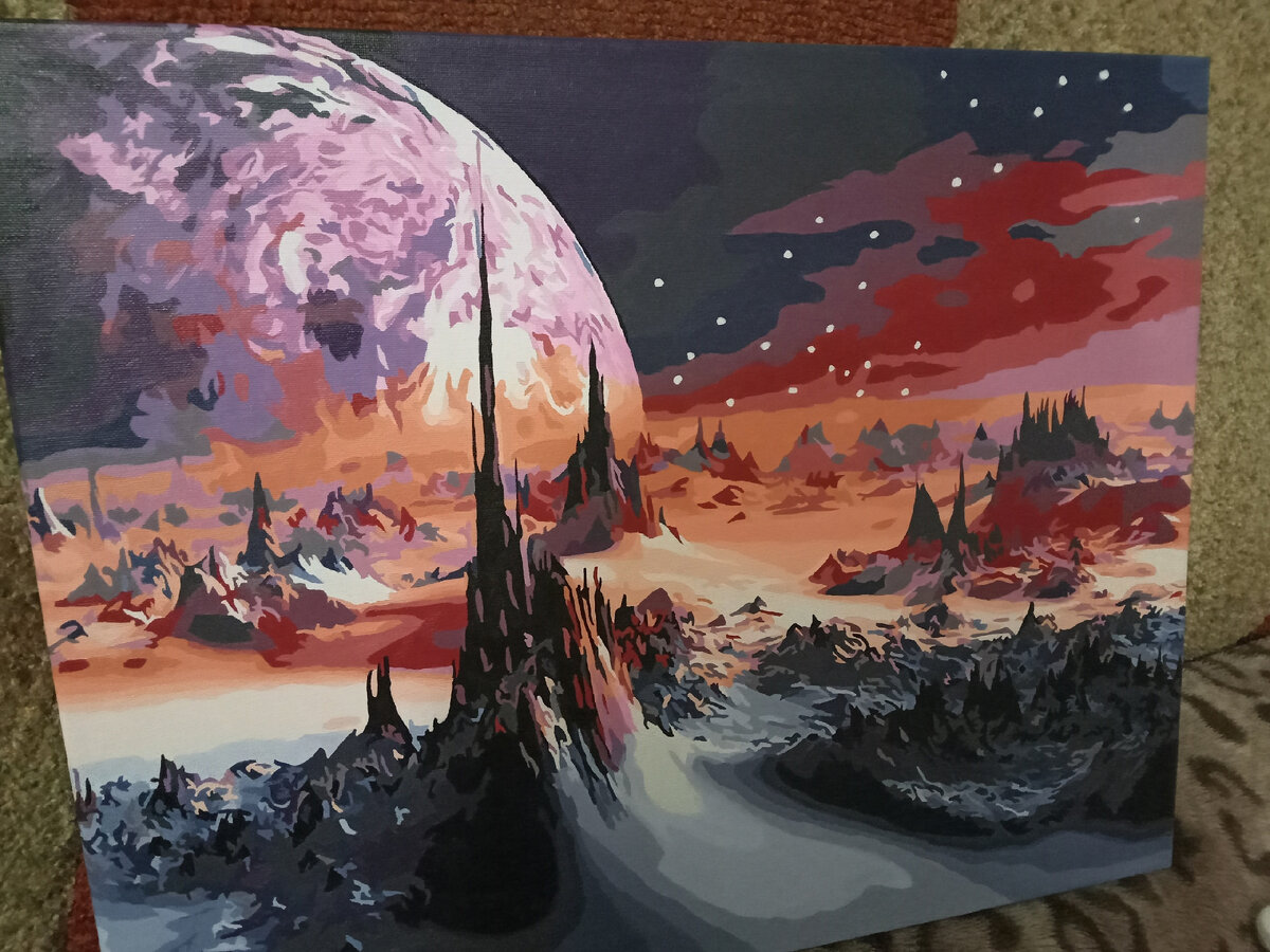 Спешу поделиться результатами распаковки! Сразу могу сказать, что картина принесла массу удовольствия. Несмотря на то, что подобные холсты обычно причиняют лишь боль, данному продавцу удалось меня знатно удивить и порадовать. Надеюсь, понравится и Вам :) Во всей своей простоте картина обладает цветом, текстурой и тенью. Плавные переходы реализованы на 5+. Под определенным углом обзора появляется настоящее изображение, которое приятно увидеть на своей стене. Да, вблизи есть недостатки - это факт. Точной целостности придать не удалось, да и мои кривые ручки внесли определенные нюансы этому изображению. Краски наносились более чем ровно, позволяя создать и легкий переход и острую отточенность линий. Светлые тона, несмотря на их привычную проблематику - легли на холст аккуратно, полностью закрасив и номер, и линию. Будто "врезные" оттенки черного особенно выделяются на холсте, делая нужные акценты на картине. И повторюсь, несмотря на всю несуразность "пятен" вблизи, на определенном рассто
