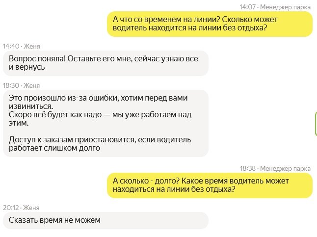 Раньше у Яндекса не было никаких ограничений по длительности времени работы. Но после нескольких громких аварий с участием водителей Яндекса, когда говорилось, что те слишком долго работали без отдыха, в Яндекс Такси появилось ограничение по времени работы для водителей. Точно сказать сколько можно проработать без отдыха - нельзя, причем сам Яндекс делает из этого какую-то тайну и в техподдержке на этот вопрос отвечать отказываются. Но, по наблюдениям водителей, программа дает работать от 12 до 16 часов. В основном это время зависит от города. Даже в техподдержке это время не сообщают. Думаю, что это связано с законом, по которому общая продолжительность управления автомобилем за календарную неделю не должна превышать 56 часов, а за две недели подряд - 90 часов. Причем программа считает не сколько времени водитель был на заказах, а сколько был в статусе "На линии". Иногда бывает, что и статус "Занят" программа воспринимает как рабочее время. Так что лучше всего полностью выходить из пр