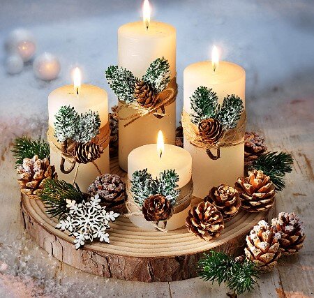 Декорирование подсвечников открыто для ваших творческих идей! Их можно украсить еловыми веточками, шишками, самым обычным шпагатом, пуговицами, мишурой и все, что попадется на глаза.