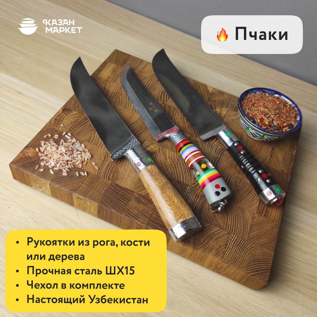 Хотим напомнить, что в нашем магазине вы можете также найти настоящие Узбекские Пчаки! Это не просто ножи, а целая культура в ваших руках Пчак - это национальный нож среднеазиатских народов. - Прямой широкий клинок клиновидного сечения с односторонней заточкой из углеродистой стали. - Рукоять сделана из рога, кости или дерева. - Изделие является исторической реконструкцией азиатского ножа. - Пчак режет за счет геометрии - практически плоские спуски и очень малый угол на РК, подводов и фасок вообще нет. - Форма заточки лезвия (от обуха в ноль) позволяет не затачивать пчак, а править о донышко тарелки или керамической кружки. Можно о металлический мусат и он снова будет отлично резать. - Сам нож замечательно подходит для нарезки мяса и овощей. - Считается хорошим подарком мужчине и незаменимым помощником на кухне. - В комплекте идут ножны из кож.зама. А чтобы узнать цены и для заказа вы можете просто написать в сообщения группы - vk.me/kazanrb или в комментариях и мы вас обязательно прок