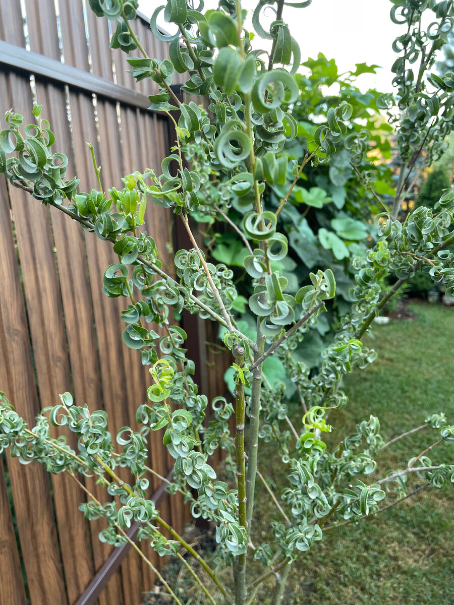 Я всегда считала, что Ива это дерево, которое растет у берегов рек. И других, кроме тех деревьев нет. А может просто раньше не было. На сегодняшний день их большое разнообразие в цветовой гамме, строении листвы, размерах. Ива Криспа растет у меня уже три года. Очень оригинальный, необычный и красивый сорт. Один из важных для меня преимуществ, что она не вырастает выше 3 метров в высоту, несмотря на ее ежегодный прирост по 30-50 см! У меня она в виде не большого деревца, а можно сформировать и кустом Особенная красота этого сорта в ее листьях. Сильно закрученные, почти спиральки, точнее барашки)) темно-зеленого цвета и блестящие. Загадка для меня - как природа такое придумывает. Посадила я ее как и положено, на солнце - она очень светолюбива и это ей необходимо для красивого цвета листьев. Любит полив как и все ивы, но заливать нельзя ни в коем случае, иначе начнут чернеть и осыпаться ее чудесные листочки-барашки. После посадки частый полив обязателен - 2-3 раза в неделю ( по погоде) по