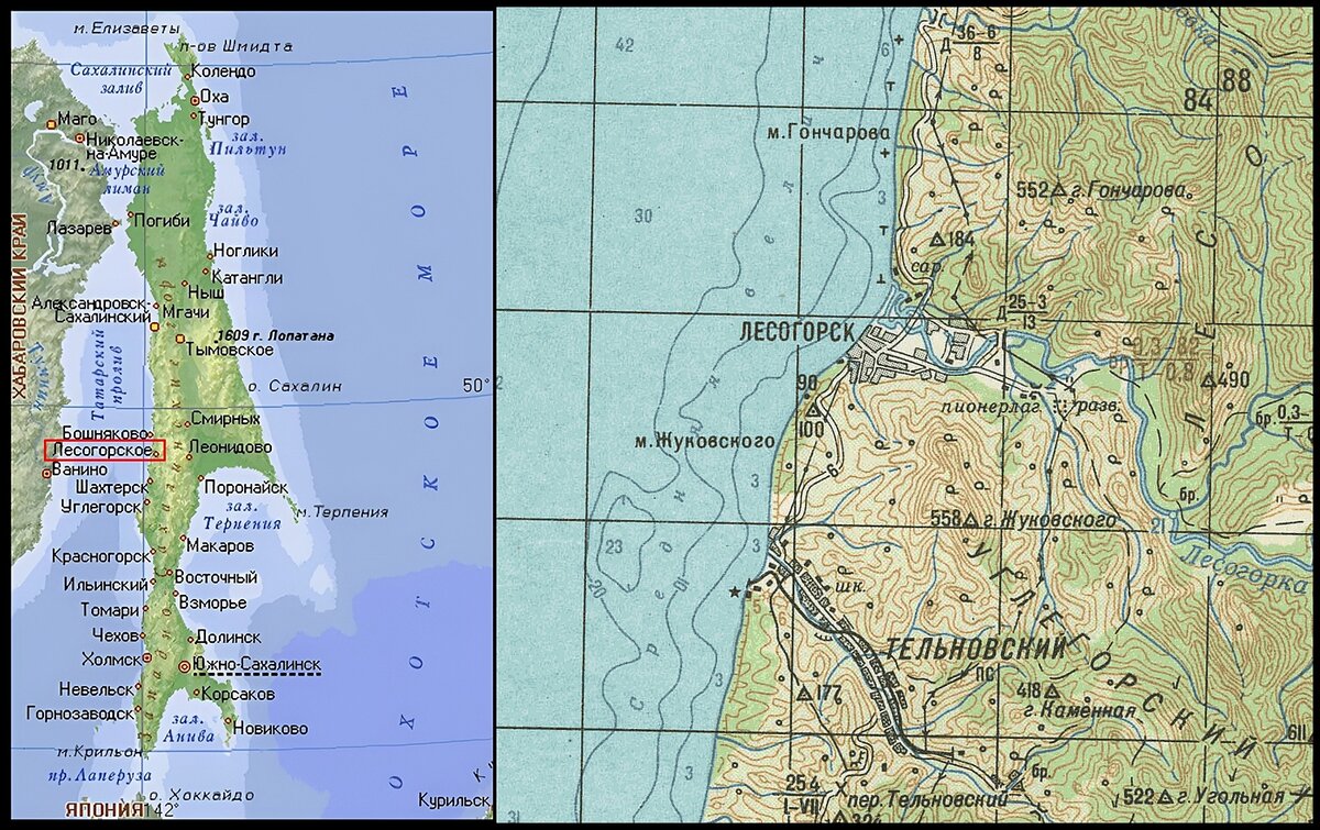 Захватив Южный Сахалин, японцы стали немедленно вырубать леса... <...> Только в Лесогорском районе японцы не успели развернуть свою «деятельность». Война помешала. И сейчас это, пожалуй, одно из немногих мест на Южном Сахалине, где леса стоят почти в нетронутом виде.