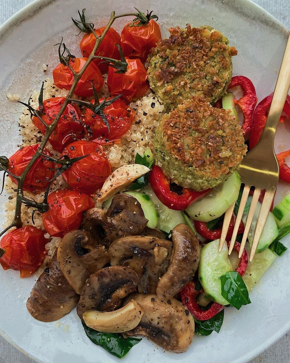 Ветка томатов черри, нарезанные шампиньоны и чеснок, политые оливковым маслом и отправленные на 20 минут в духовку при 200°C — это ооочень вкусно. В такой компании любые киноа, рис или гречка станут вкуснее.