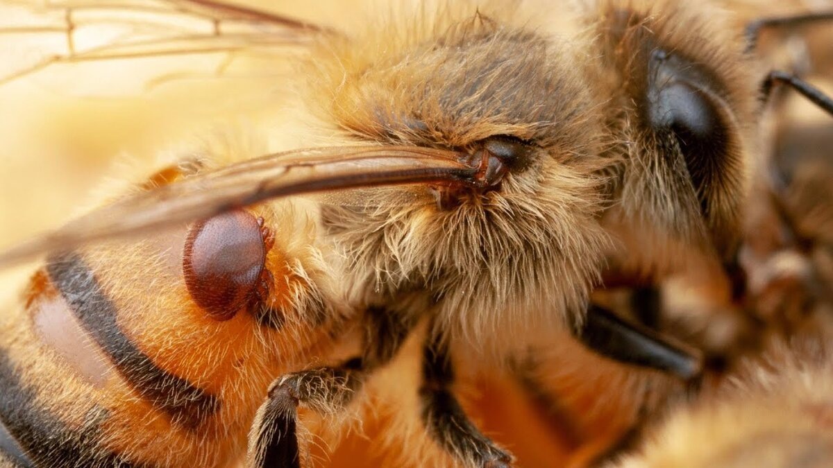 Это паразит, нет, ПАРАЗИТ, который живёт прямо на пчеле. Он имеет плоское тело, похожее на перевернутое овальное блюдце с торчащими нижними конечностями, покрытыми волосками. Четыре пары ног клеща позволяют ему ползать и помогают удерживаться на пчеле.