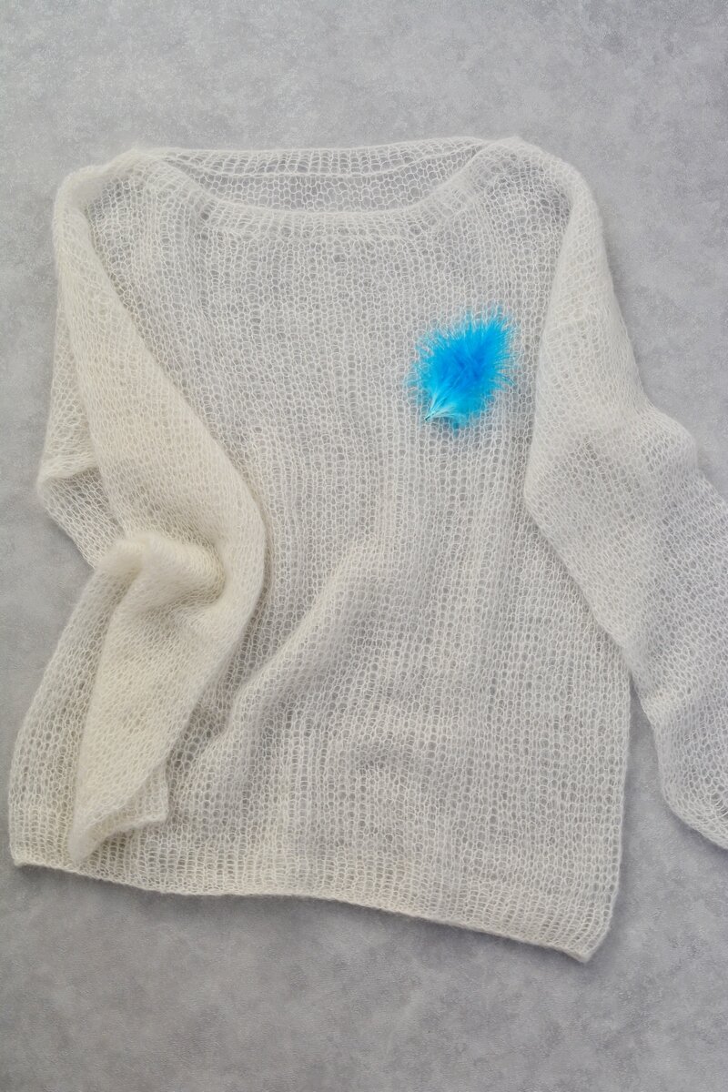 На этот раз белая. Пряжа Silk Mohair Lana Gatto. Краткое описание. Но для каждого номера спиц надо рассчитывать количество петель. Набрала на спицы №4 150 петель, замкнула в круг и провязала на круговых спицах 10 рядов резинкой 1х1, затем перешла на спицы №5 и вязала нужную высоту до подрезов, для меня это 47 см. Затем закрыла для подрезов по 4 петли справа и слева, и далее вязала раздельно перед и спинку. От подрезов еще 17-18 см. Затем закрываем петли горловины. Для переда горловины закрываем центральные 14 петель, затем через ряд 4,3,2,1,1. На спинке закрываем центральные 36 петель. Получается горловина лодочка. Сшиваем плечи. Для рукавов набираем петли из проймы и вяжем по кругу нужную длину. Это такое простейшее описание, вяжите на здоровье! #вязание #джемперпаутинка #вязаниеспицами