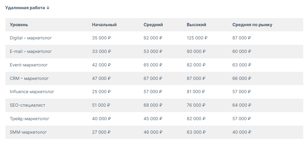 На основании вакансий с сайта, посчитали среднюю зарплату маркетологов на российском рынке. В отчет не учтены зарплаты руководителей, и отдельно не выделена Москва и другие конкурентные регионы. В таблице указана статистика по стране. По ней – можно узнать, сколько зарабатывают маркетологи в России в декабре 2022.