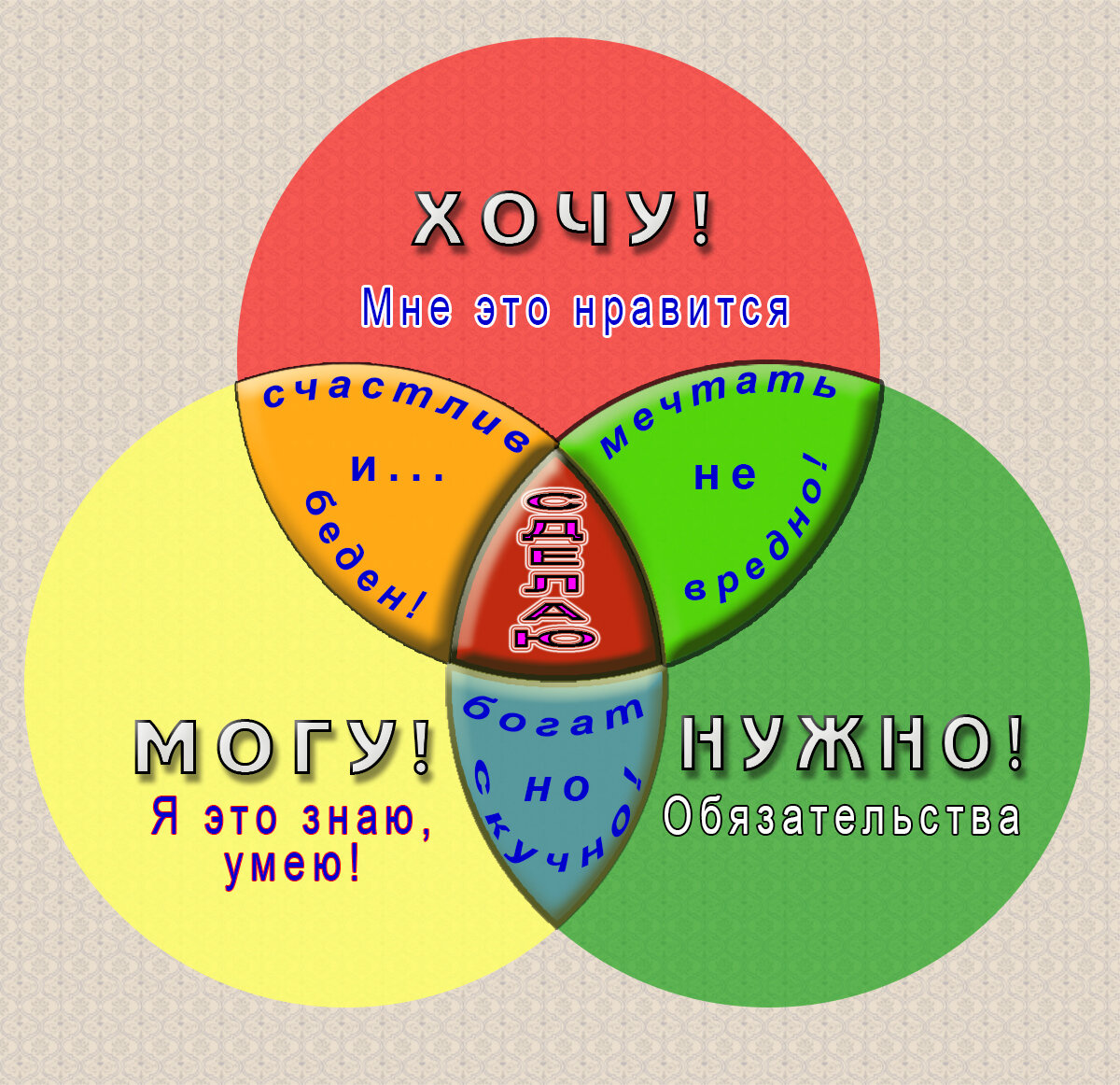 А вот если еще сказать «Мне это надо!». Это уже мощный внутренний призыв. Тут и надо, и долг, и внутренние обязательства. Если я так себя замотивировал, значит это мое желание, а не просто «хотелка». Если так решил, - значит так и будет! Если для этого возможности? Я их найду! Потому что хочу, и потому что надо!