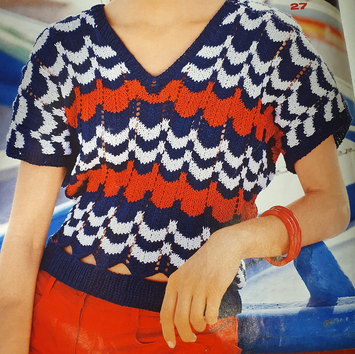 Симпатичный пуловер. Связан волнами. Простой рисунок вязки. Простая выкройка. А выглядит весело. Размеры указаны 34/36 (38/40) 42/44. В переводе на русский это 40/42 (44/46) 48/50. Пряжи надо: 300 - 400 г темно-синей, 150 - 200г белой и 100 - 150 г красной. Разумеется, можно цветовую гамму поменять. А вообще - надо просто посмотреть на остатки свеоей пряжи. Наверняка найдутся неиспользованные остатки пряжи разных цветов. Волнистый узор вяжем по схеме: Полосы чередуются в такой последовательности: Спинка. Вяжем по выкройке: Плотность вязания 23 петли и 25 рядов = 10 см. Набираем на спицы 86 (98) 110 петель темно-синей пряжей и вяжем 1 изнаночный ряд лицевыми петлями. Затем вяжем волнистым узором в указанной последовательности. Через 8 рядов делаем прибавления: по 1 петле с обеих сторон в каждом 4-м ряду 2 (3) 4 раз и в каждом 2-м ряду 21 (20) 19 раз по 1 петле, 1 раз 3 петли и 1 раз 4 петли. Через 46,5 ( 49,5) 53 см все петли закрываем. Перед. Вяжем аналогично спинке, но вывязываем тр