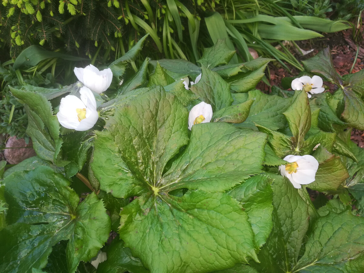 Вот такой интересный цветок, с трехпалыми листочками и цветочком на макушке. Его еще ноголистом называют. Жутко ядовитый, жутко лекарственный, но для меня просто красавчик. Не все его ляюбят, многим он не нравится. А мне очень нравится. Семейство Барбарисовых, но последнее время выносят и в отдельное семейство Подофилловых. Есть у него еще несколько братиков. С красивыми листочками, розовыми цветочками, есть многоцветковый. Рассказывать о том, чего не видела, не имею, сегодня не буду, хоть они и достойны внимания, а то меня уже "упрекают", что соблазняю, дразню... Мой подофилл гималайский или щитовидный(?). Сомневаюсь везде... Писал мне год назад Валерий Марушин, какой, да ой, так далеко кутить... У него разные есть... Очень привлекательные... Говорят, семена не прорастают. Как видите, прорастают. Это прошлогодние. Сколько лет ждать декоративности, понятия не имею. Первые, которые я посадила года три назад, в бой не рвутся, так и сидят малышами. Попали они ко мне случайно. Бабулька у
