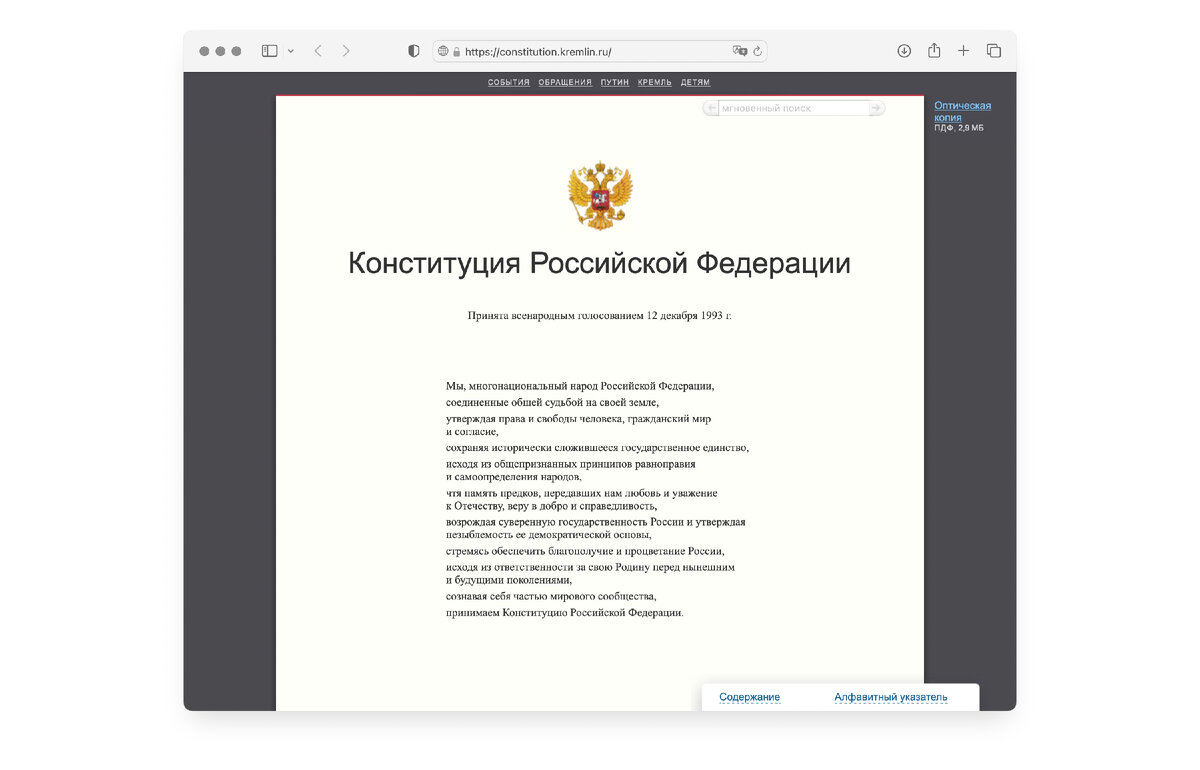 Сегодня День Конституции России. В 2009 году Бюро Горбунова разработало лучший в мире официальный сайт главного закона страны, состоящий всего из одной страницы. Сайт проработал 11 лет по адресу constitution.kremlin.ru Посмотреть бюрошную версию сайта конституции