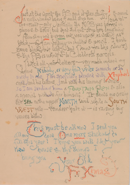 Top of the World, North Pole Xmas 1929 Dear Boys and Girl It is a light Christmas again, I am glad to say—the Northern Lights have been specially good. There is a lot to tell you. You have heard that the Great Polar Bear chopped his paw when he was cutting Christmas Trees. His right one—I mean not his left; of course it was wrong to cut it, and a pity too for he spent a lot of the Summer learning to write better so as to help me with my winter letters. We had a Bonfire this year (to please the Polar Bear) to celebrate the coming in of winter. The Snowelves let off all the rockets together, which surprised us both. I have tried to draw you a picture of it, but really there were hundreds of rockets. You can’t see the elves at all against the snow background. The Bonfire made a hole in the ice and woke up the Great Seal, who happened to be underneath. The Polar Bear let off 20,000 silver sparklers afterwards—used up all my stock, so that is why I had none to send you. Then he went for a