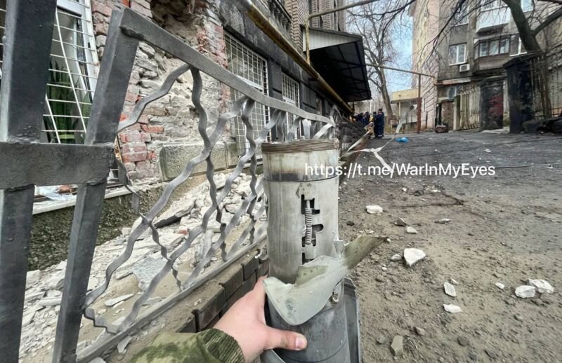 На заглавном фото: Место прилёта двух ракет РСЗО «Град» в Ворошиловском районе Донецка, во дворы по улице Постышева. Снаряд производства 1967 года, пишет Телеграм-канал Война глазами журналиста