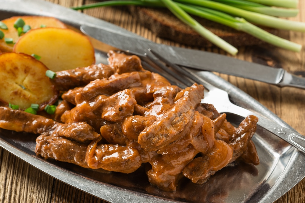 Бефстроганов — русское блюдо, в котором молодая говядина нарезается полосками и прожаривается в легком сметанном соусе. Прелесть рецепта такого мясного блюда в том, что мяса может быть немного, но за счет соуса, гарнир будет просто сказочно вкусный. Нежная говядина в сметанном соусе разнообразит простые блюда и станет прекрасным дополнением к любому гарниру. Пошаговый рецепт Ингредиенты